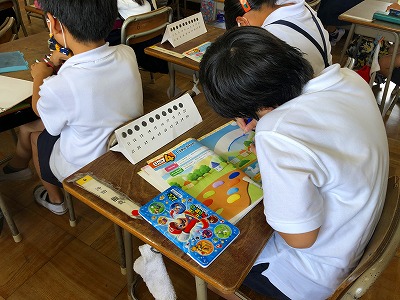 今日の3年生の授業は、I like blue.という文から、色の学習をしました。自分の好きな色で虹を描き、色の名前を覚えていきました。個人差がある学習なので、アクティビティーや歌などを交えて、楽しく学習を進めていました。授業中もたくさん手が挙がり、みんなが積極的に英語を話していました。