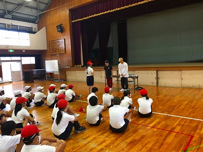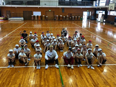 今年の「夢授業」の講師は、ダンスの世界的パフォーマーであるKAKU(角谷直人)さんと、MAO(大上真生)さんに来ていただき、ブレイクダンスのスピンのやり方を教えていただきました。なかなか難しい技ですが、ヒップ(尻)スピンをマスターし、バック(背中)スピンもできる子も少しいました。