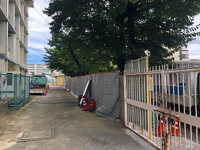 学校の東側には、高いブロック塀が連なり、数年前の地震の教訓から大阪市ではブロック塀を金属製の外から見れる塀に付け替えるようにしています。