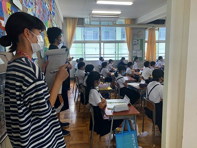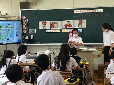 教員は、授業の質を高めていくため全員が年間に1回は、他の先生たちに見てもらう授業をします。この日は、5年生の英語の授業で、物の在り処を英語で尋ね答える内容です。授業の指示やリアクションなどもほとんどが英語でしたが、子どもたちはたいへん反応がよく、しっかりと活動ができていました。