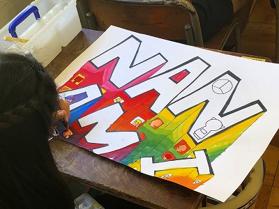 5年生の教室をのぞくと、名前を立体的にデザインしたものに、グラデーションの技法を使って絵画の色付けをしていました。