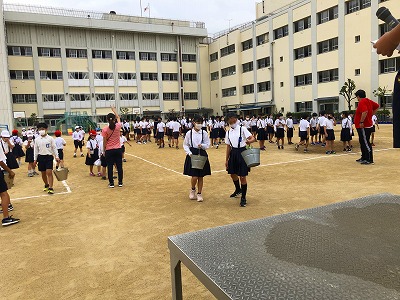 できるだけ、集まらずにお話もしないで、石を拾っていきました。運動委員会の子どもたちがバケツを持って回収していきます。