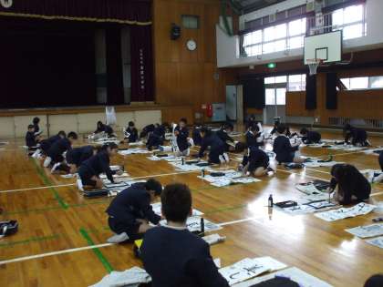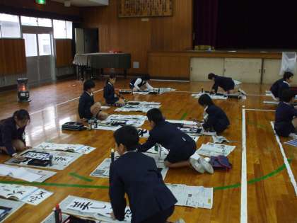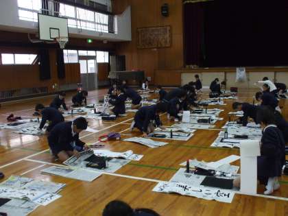 1月14日(水)、2時間目、4年生は講堂で書初めを行いました。同じ人が写っているかもしれませんが、力作をご覧ください。