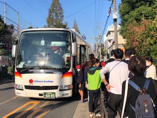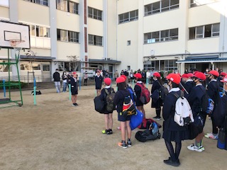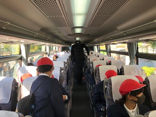 午前7時40分 運動場で出発式を行いました。児童代表から、しっかり学習してくると決意表明があり、バス2台に分乗して新大阪駅を目指しています。