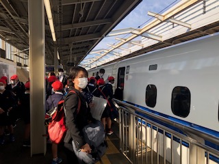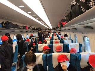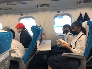 修学旅行専用のぞみ号に乗りました。車内は、基本的にはお話は禁止で、みんな自分で用意してきた本を読む人が多いです。