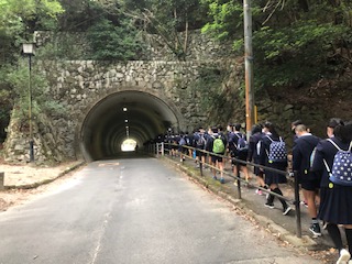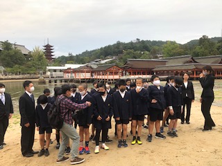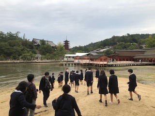 宮島に到着して、明日の天気を考え、予定を変更して厳島神社まで足を運び、学級ごとに記念撮影をしました。潮が引き始めていたので、干潟で神社をバックに撮ってもらいました。