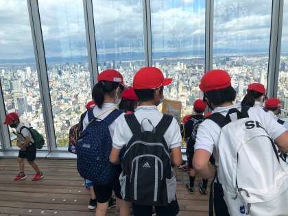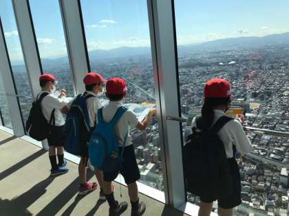 あべのハルカスでは、地上300mの景色から大阪市の町並みを一望することができ、子どもたちは「景色がすごく綺麗で感動した!」「あそこが大阪城だよね!」と、楽しみながら学習することができていました。