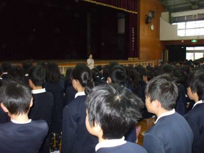 1月29日(木)、講堂で児童集会を行いました。この日は、2月2日(月)に実施予定の「みまもり隊と青パトの方への感謝の会」で贈る歌の練習です。当日、心を込めて大きな声で歌いましょう。