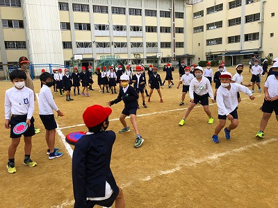 コロナウィルス感染症の影響でこれまで実施できなかった異学年交流を実施しました。この日は3年生と4年生がドッジビーを楽しました。