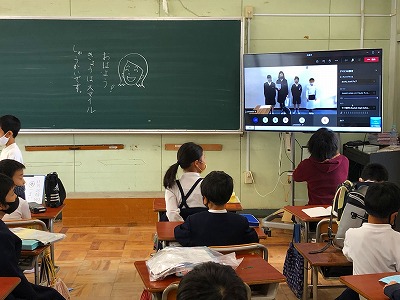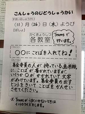 今朝のスマイル集会は、リモート画像での集会としました。内容は、「〇〇に言葉を入れてね」です。集会委員が自作したボードの中の文字がいくつか抜けています。ヒントからその文字を入れて、言葉を完成させます。