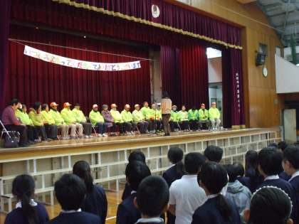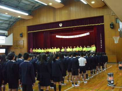 いきものがかりの「ありがとう」の歌を全員で合唱しました。歌詞は、6年生がみまもり隊と青パト隊の方々への気持ちを込めたものに替えています。