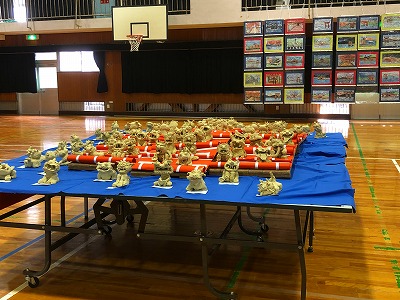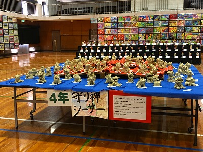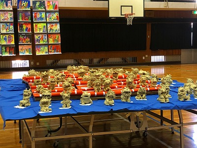 4年生の作品は「守り神シーサー」です。自分たちが調べ学習をした沖縄の守護神シーサーをいろいろな表情で作り上げていきました。