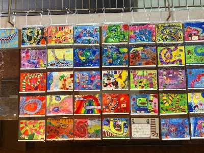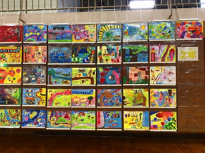 2年生の作品は「せんろはつづくよ」です。「LOVE&PEACE電鉄」で行く、85の楽しい世界への旅を絵画で表現しました。