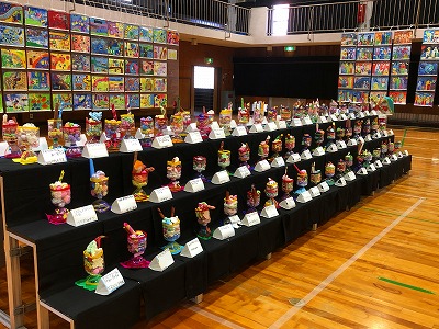 1年生の作品は「パフェ!パフェ!パフェ!」です。世界で一つだけの特別なパフェをペットボトルを使って作りました。どうぞ、召し上がれ!