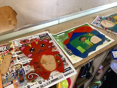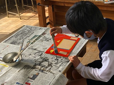工作室をのぞくと5年生が、絵を描いた板にニスを塗っていました。伝言板を作っているそうです。色のついていないところにホワイトボードを張り付けてできあがりとなります。ニスを塗ると光沢が出て、立派に見えます。