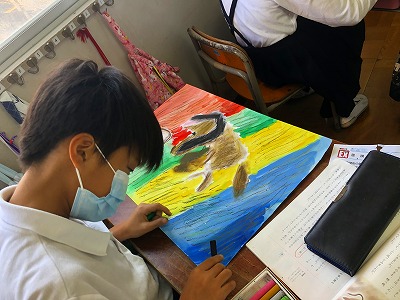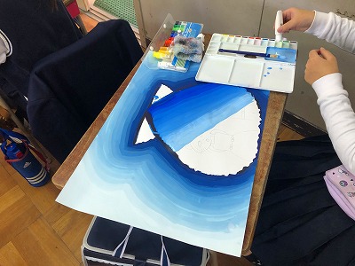 4年生の教室では、水彩絵の具で絵を描いていました。グラデーションや「ぼかし」などの技法を使って、きれいな絵が描けていました。