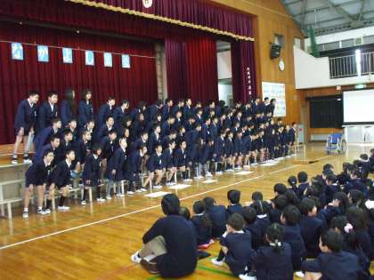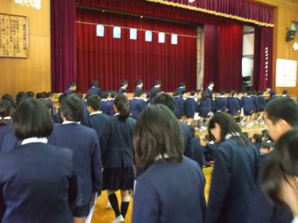 緊張した面持ちで、舞台へ進みました。アイマスク体験、車いす体験の報告をしてくれました。