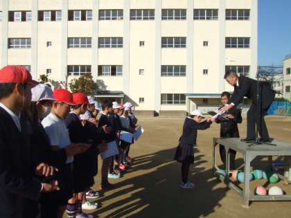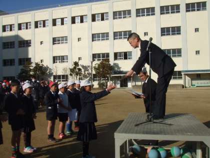 2月9日(月)、前の日に高殿会館で「高殿ジュニア防災リーダー」の結団式があったことは以前お伝えしました。その委嘱状を、全校児童の前でも渡しました。これから、少しずつ研修を重ねてください。