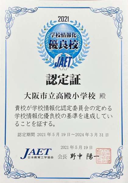 ICTを活用した取り組みにより、引き続き2021年5月19日より、約3年間の期間、学校情報化優良校の認定を受けることができました。