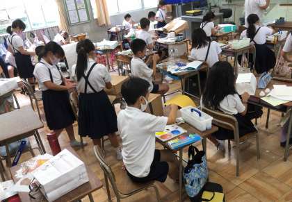 持ってきた材料を使って、紙袋の中に自分の考えた世界を表現しました。