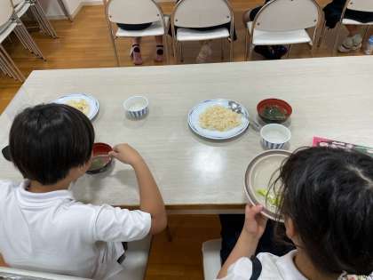 昼ごはんはピラフでした。最後までおかわりしている子どももたくさんいました。ごちそうさまでした。