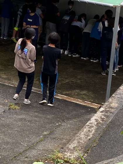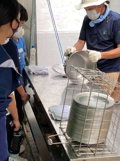美味しくカレーをいただいた後は、使った用具の片付けです。すすで真っ黒になった鍋や飯盒をきれいに洗いました。チェックは厳しく、一回で合格になった班はありませんでした。しかし、みんなで協力して洗い、どんどん合格していきました。早く合格した班は部屋で休憩です。