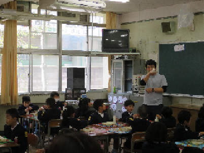 今年度一番最初の給食はお祝い献立の「カツカレーライス・フルーツ白玉・ミニフィッシュ・牛乳」でした。初めての給食に一年生はドキドキ。担任の先生に、給食当番のやりかた、エプロンのたたみ方、牛乳キャップの開け方などたくさんのことを学びました。初めて牛乳びんのふたを開ける作業には、「むずかしい…」と悪戦苦闘しながらも一生懸命に開けていました。カレーライスの中には、たくさんのラッキーにんじんが入っており、ハートやちょうちょを見つけては歓声が上がっていました。中には、ラッキーにんじんのかけらをじっと見ながら、「キラキラの星の形みたい!」「お魚さんみたい!」と楽しそうに食べている姿が印象的でした。