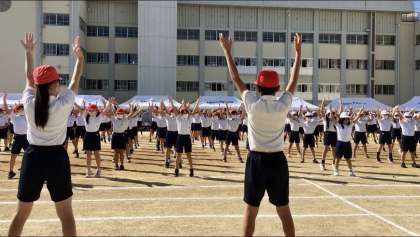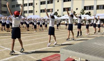 中学年の部の始まりです。はじめの体操で、体をほぐします。