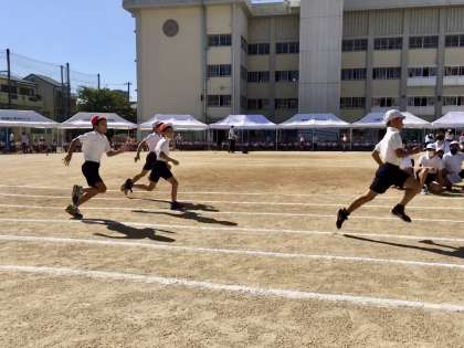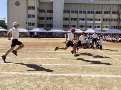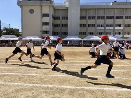 4年生による徒競走、「走れ〜魂を込めて」です。走るフォームも、きれいです。どんどんスピードに乗って、疾走します。