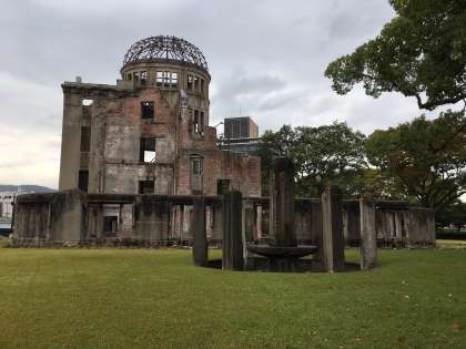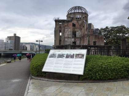 雨の原爆ドームです。被爆前は、広島産業奨励館というモダンな建物でした。