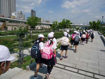 科学館の前でお弁当を食べた後は、堂島川沿いに東に進み、日本銀行大阪支店、大阪市役所、中央公会堂を見ながら歩きました。中央公会堂では、中の展示室にも入って、歴史ある建物についての学習もしました。