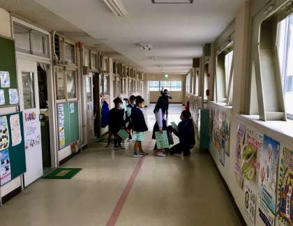 今週から2年生は、「九九の暗唱」を担任の先生以外にも聞いてもらう活動を始めました。写真は休み時間の、職員室前廊下です。もう、たくさんの子どもたちが、集まっています。「上り九九」と「バラバラ九九」のチャレンジ。目標をクリアすると、サイン、シール、スタンプなどを、チャレンジカードにもらえます。がんばれ!