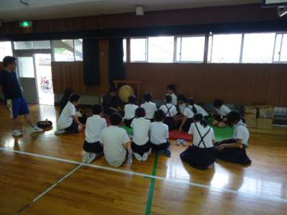 そして、寄席囃子の実演や南京玉すだれの実演を一通り経験したあとがお稽古タイムです。(1)南京玉すだれチームと(2)寄席囃子チームと(3)舞台製作チームに分かれて練習しました。