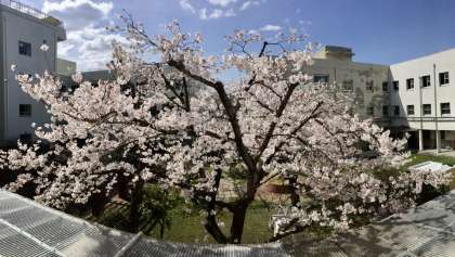 今年も中庭の桜が、美しく咲きました。お昼には、いきいきで登校した子どもたちが、お花見をしています。   高殿小学校長 梅原直人