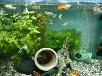 職員室前の水槽では、グッピーやコリドラスなどの熱帯魚を飼育しています。