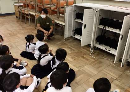 まずタブレット学習のルールを学び、次に学年室のタブレット保管庫へ、タブレットを取りに行きました。