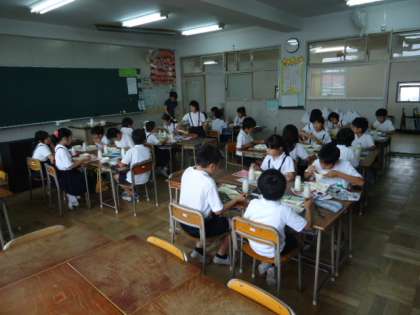 1年生は6年生と、2年生は5年生と、3年生は4年生と一緒に食べました。