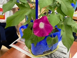 1年生が5月から大切に育てている、あさがおの花が咲き始めました。子どもたちは水色やピンク、紫など色の違いを楽しんでいます。