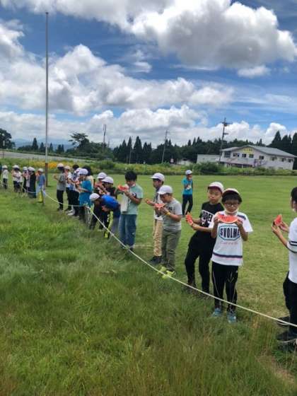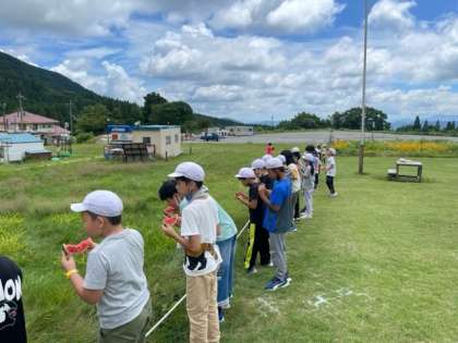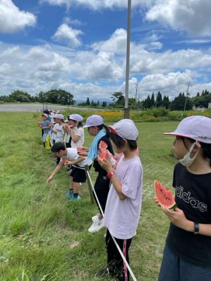 芝生広場で、スイカにかぶりつく子どもたちです。