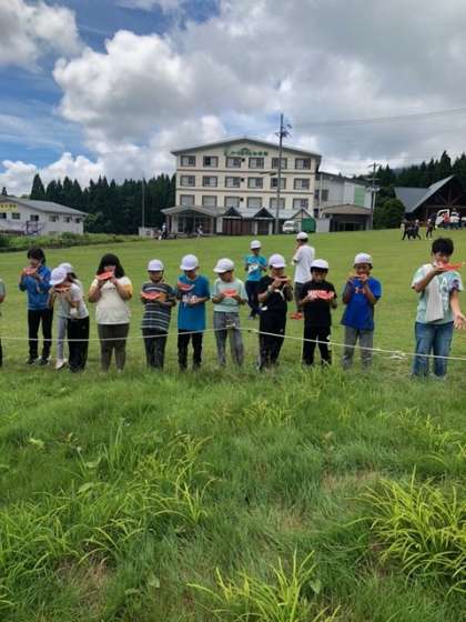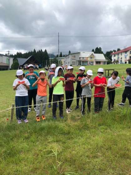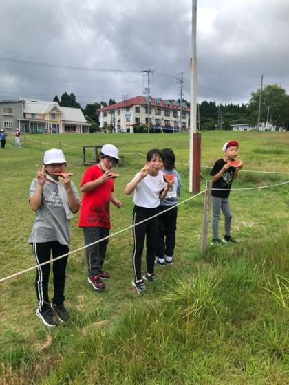 林間学習 2日目 スイカにかぶりつく子どもたち