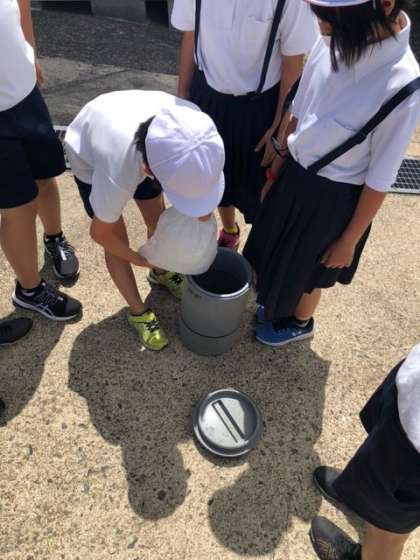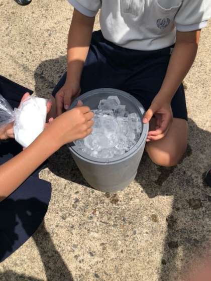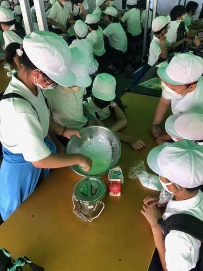 十分に混ぜたアイスのもとを、冷却用容器に入れて氷で包みます。