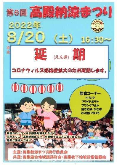 1学期末にお手紙でお知らせし、8月20日(土)に開催を予定していました「高殿納涼祭り」ですが、新型コロナウイルスの再拡大の影響により延期が決定しました。