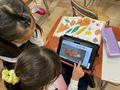 教室に帰ってきてからは、タブレットのペイント機能を使って絵を描きました。子どもたちは、友だちと完成した写真を楽しそうに見せ合っていました。