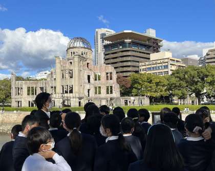 学習会で語りべさんの貴重なお話を聞き、平和集会を行いました。全校で折った折り鶴を捧げ、平和を願い『平和の歌』をうたいました。