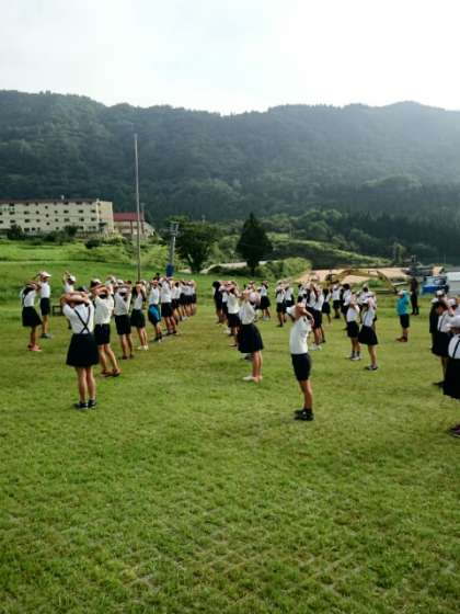 林間学習三日目の朝のつどいは、昨日と同様に、宿舎前の広場で行いました。