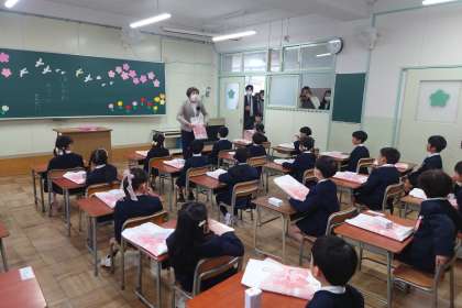 入学式が終わり、それぞれの教室に戻ったあと、担任の先生のお話を聞きながら、楽しく過ごしました。