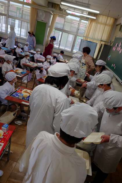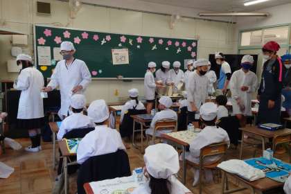 今日からしばらく、6年生のおにいさん、おねえさんが、配膳のお手伝いをしてくれます。