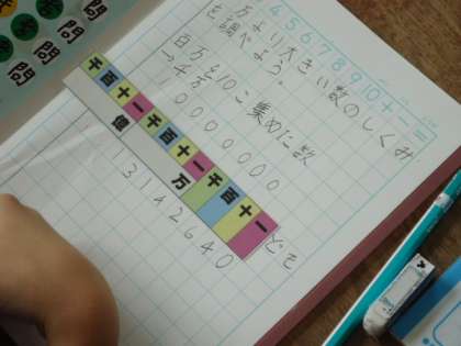 この位取り表は、ノートのマス目と同じ大きさで作ってあったり、位を色分けしていたりとなかなか工夫されたアイテムです。