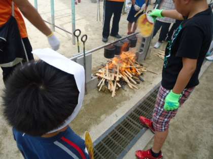今は、昼食のカレー作りと飯ごう炊さんをしています。