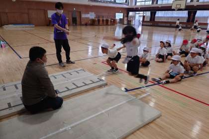 反復横跳びや、立ち幅跳びなど、やり方のコツを教わりながら、チャレンジしました。